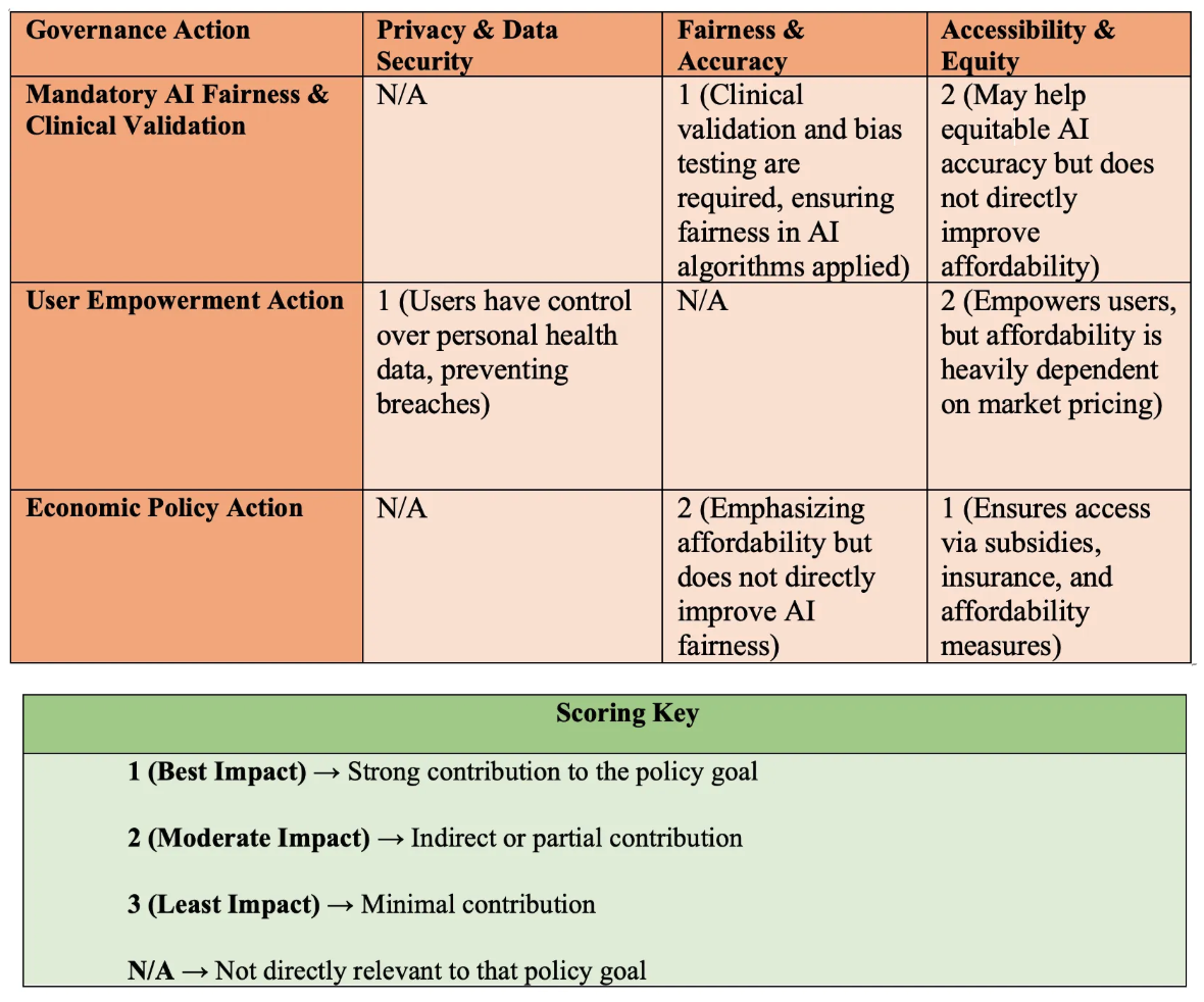 Below is a detailed scoring chart that evaluates each governance action against the policy goals using specific criteria: