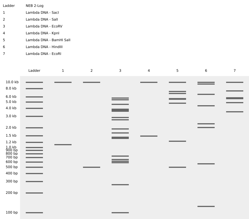 I simulated a restriction digest on λ‑DNA (E. coli bacteriophage) in Benchling using several restriction enzymes: EcoRI, HindIII, BamHI, KpnI, EcoRV, SacI, and SalI. Each enzyme recognizes its own specific DNA sequence, producing different fragment patterns depending on how many cut sites are present. Some enzymes generate sticky ends, while others like EcoRV create blunt ends. By comparing the band patterns, we can see which enzymes cut the DNA, how many fragments they produce, and estimate fragment sizes—from large fragments (~10 kb) to very small ones (~100 bp). If an enzyme doesn’t cut, the result is a single intact band.