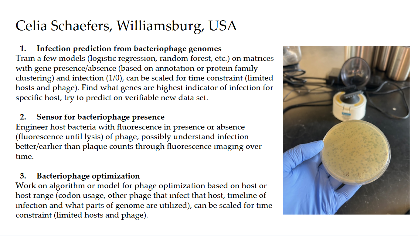 Celia Schaefers is a second-year undergrad at William & Mary studying computer science and applied math. She does computational research related to bacteriophage and other mobile genetic elements. This includes contributing to pipelines for phage identification (in metagenomics) and assembly, and using AlphaFold and Foldseek to identify conserved structural domains and potential functional mechanisms in phage proteins. Given her more computational background, Celia is excited to learn more about synthetic biology and gain more wet-lab experience through this course.