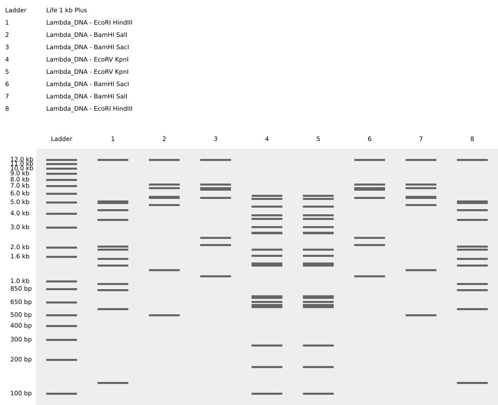 EcoRI HindIII BamHI KpnI EcoRV SacI SalI I create a pattern that simulates angel feathers in benchling. I use the tool https://rcdonovan.com/gel-art to guide me c: