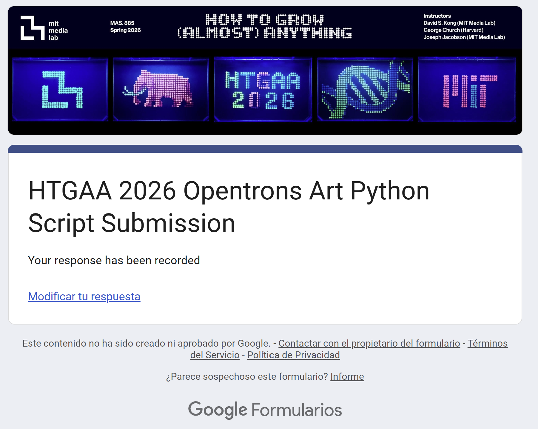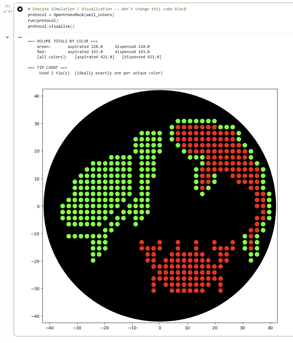Later, I simulated the design in the Opentrons Colab. This protocol programs the Opentrons robot to create an artistic pattern on an agar plate using two fluorescent proteins (mRFP1 in red and sfGFP in green).