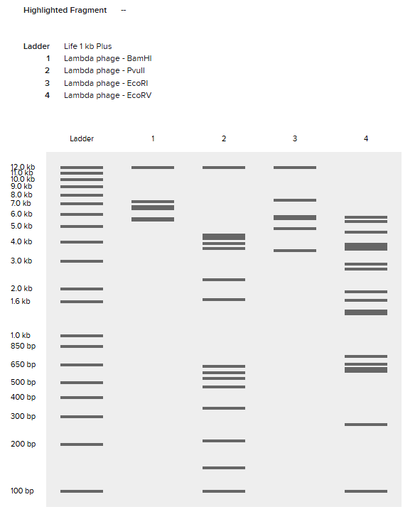 Restriction site positions for 10 enzymes were extracted from Benchling for the λ phage genome. Based on these cut positions, fragment sizes were calculated for each individual enzyme digestion.