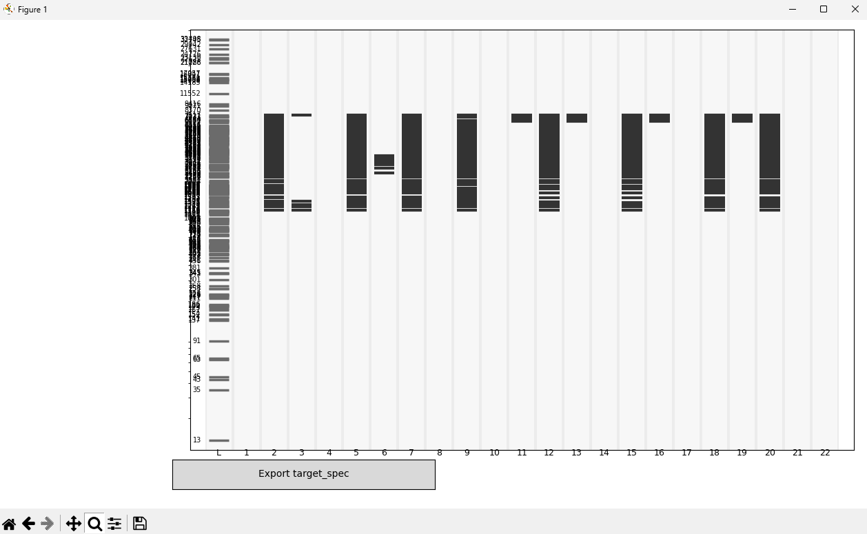 A desired visual pattern was manually designed using an interactive executable that allows activation/deactivation of bands on the real fragment size axis.
