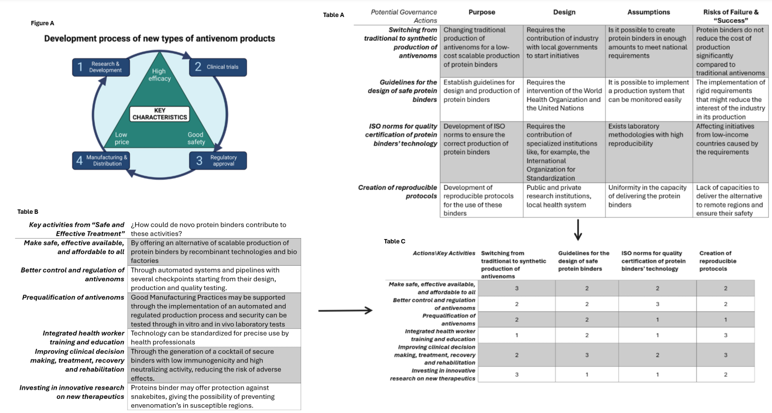 The implementation of these protein binders as an alternative to traditionally-produced antivenoms should meet with these 5 key activites. The image below analysis how portein binders could contributo to these key activities and proposes 4 potential governance actions according to the objetive and key activites proposes by the WHO (Figure 4)