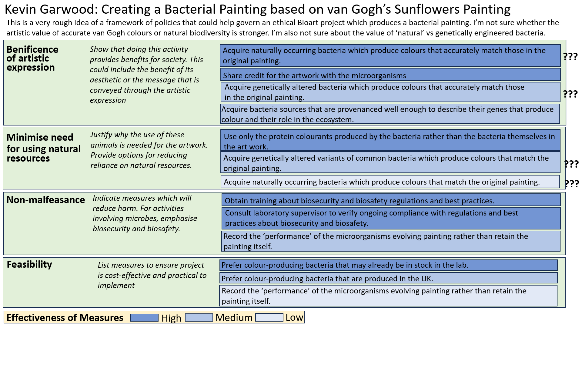 Beneficence of artistic expression actions would be the third most important area to prioritise. Once I become familiar with catalogues for ordering colour-producing bacterial sources, I should be able to acquire extra information about each species and at least some understanding of the genes which are responsible for making coloured proteins. I would not be suprised if matching colours with the original painting pigments may be a very rough guess! But, I do expect there would be enough basic bacterial hues to work with to make the work recognisable as a version of Van Gogh’s Sunflowers painting.