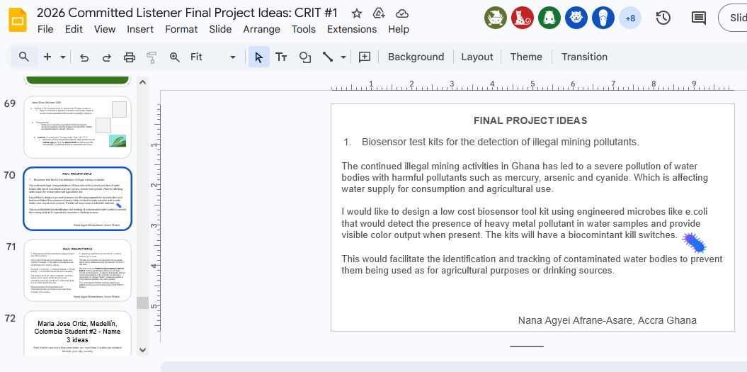 Using my first idea, which involves developing a biosensor kit for the detection of illegal mining pollutants. The automation tools used would be a combination of Python-based liquid handling, 3D-printed assay holders, and could-based design tool like Google Nebula.