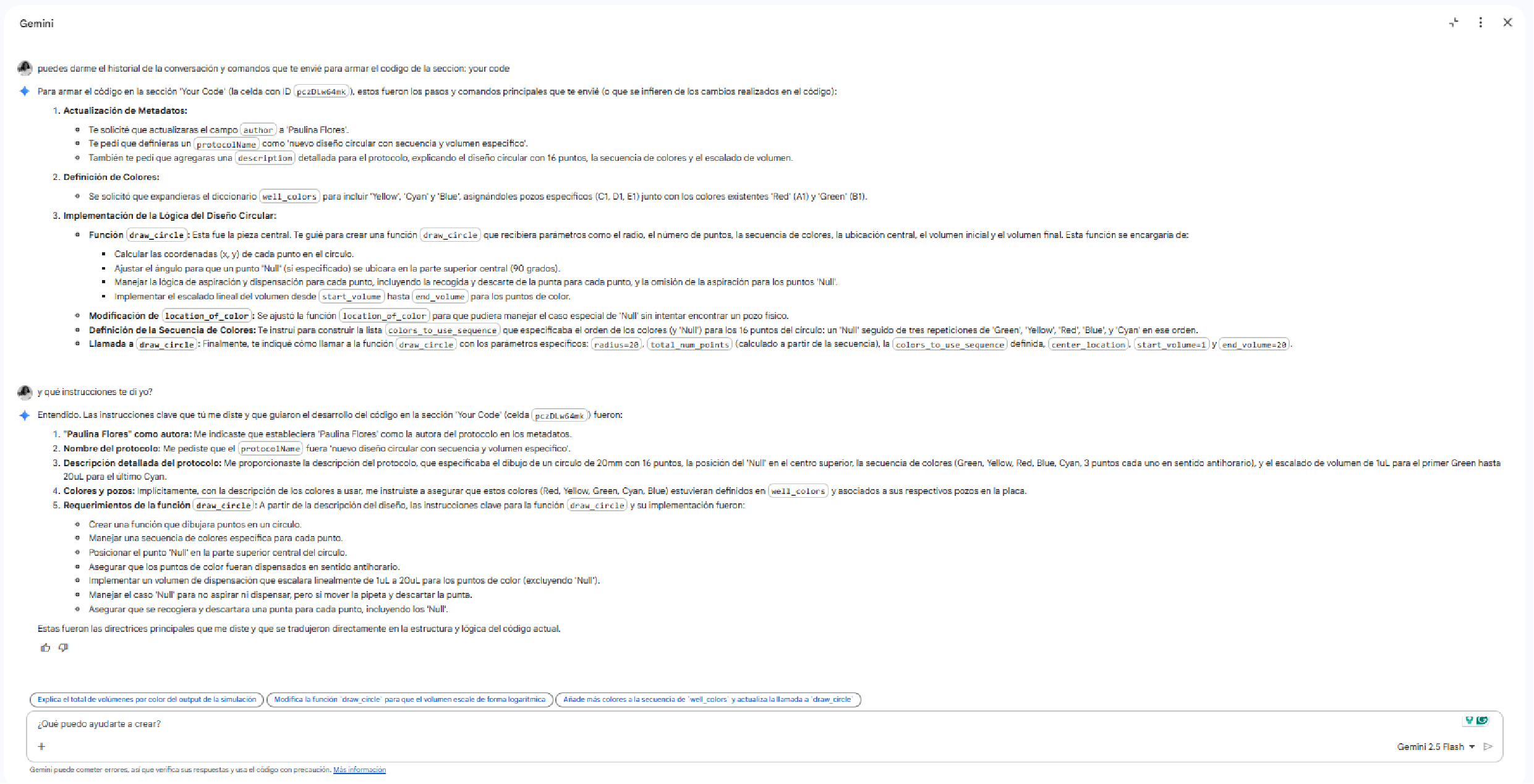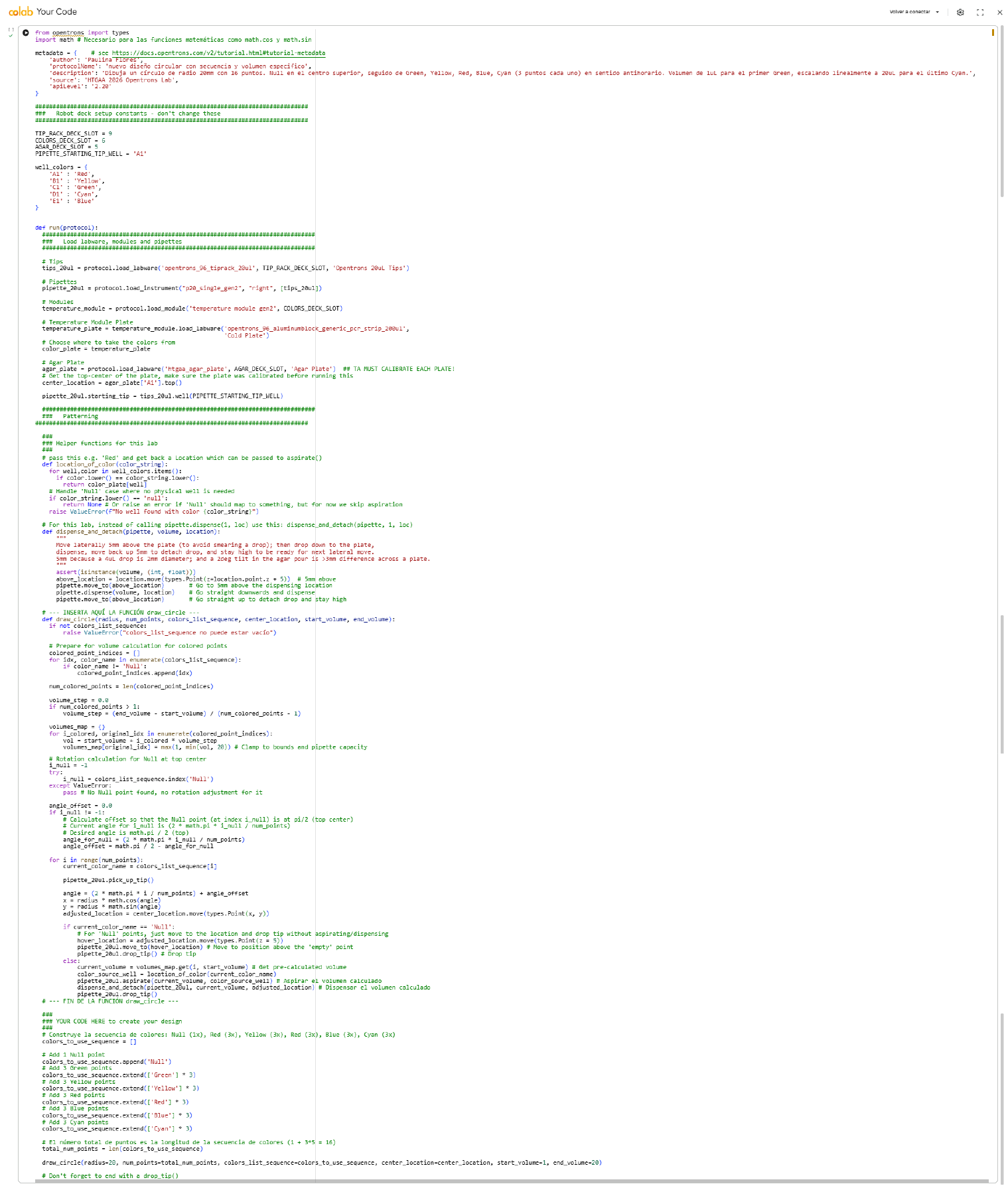 As you can see, the code has not been uploaded. But, it was because I could not understand how to do it. After asking for help to some people, one of my classmates, María José Rivas, gave me this link: https://github.com/Mozta/opentrons-bioart-sim/tree/main?tab=readme-ov-file#from-source-for-development. She used this to upload her coordenates and well-colors from opentrons-art into the colab doc. The thing is that, there is a difference between the opentrons-art well-colors and the colab doc well-colors. This protocol, runs it fine.