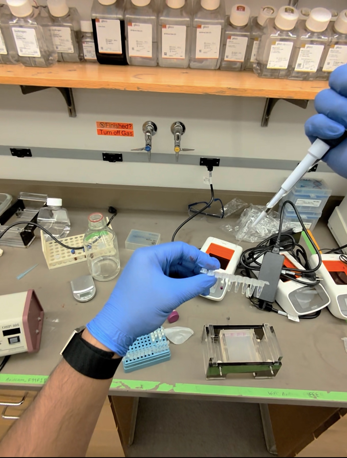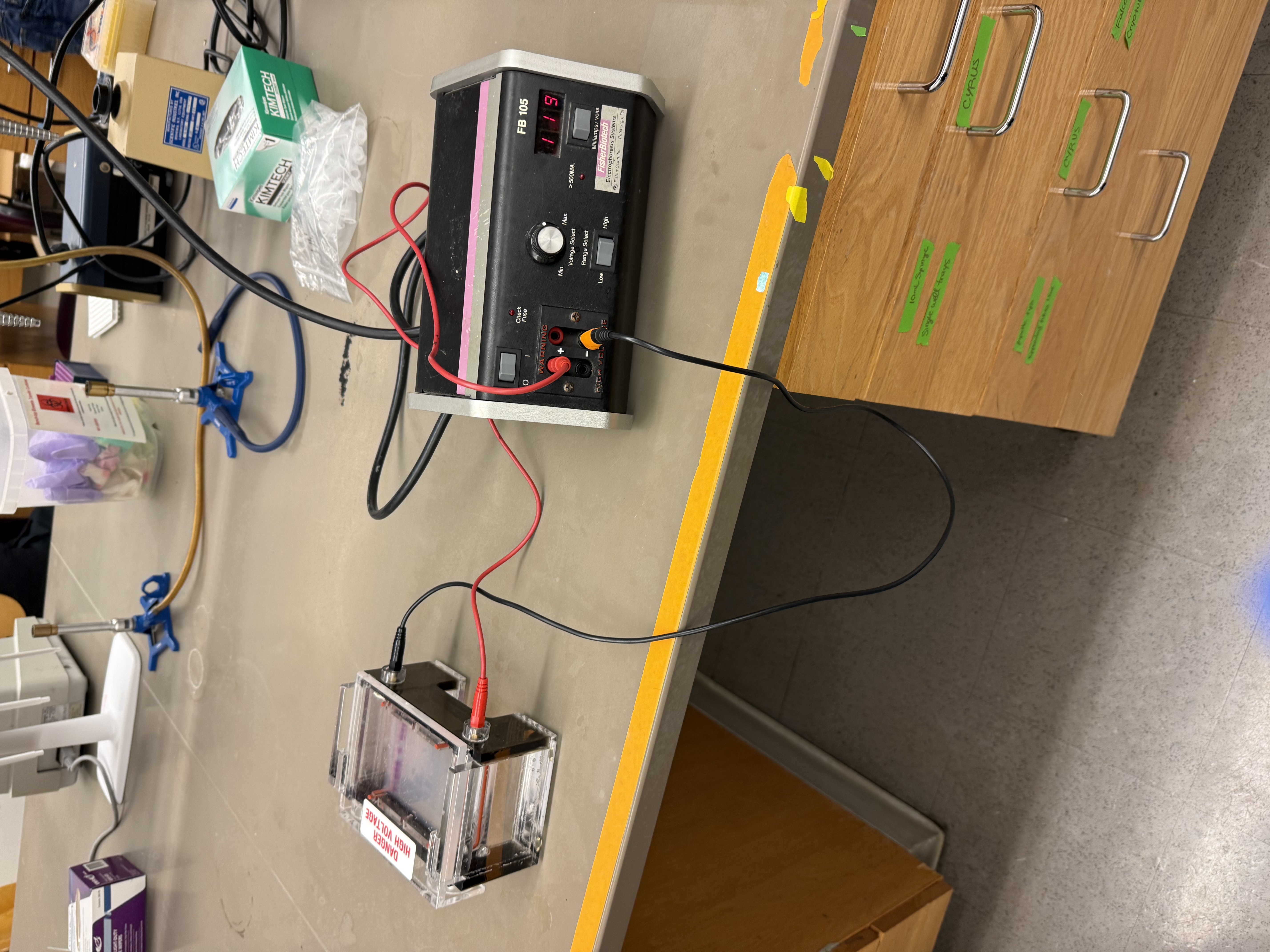 After the gel set, I removed the comb, filled the gel box with 1x TAE buffer, and mixed my DNA samples with loading dye. I carefully loaded each well without puncturing the gel and ran the gel at around 80 to 115 volts for about 45 minutes to separate the DNA fragments by size.