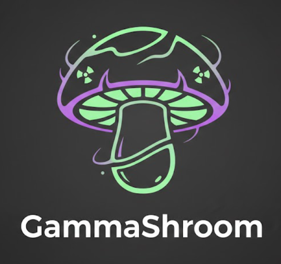 “A futuristic biotech logo featuring a stylized mushroom inspired by radiation-absorbing fungi, glowing with soft neon green and purple energy. The mushroom cap resembles a subtle mushroom cloud shape but abstract and scientific, not violent. Clean minimal design, smooth vector style, centered composition. Include subtle radiation symbol elements integrated into the mushroom texture. Modern biotech aesthetic, sleek typography reading “GammaShroom” below the icon. White or dark gradient background, high contrast, professional scientific branding style.”