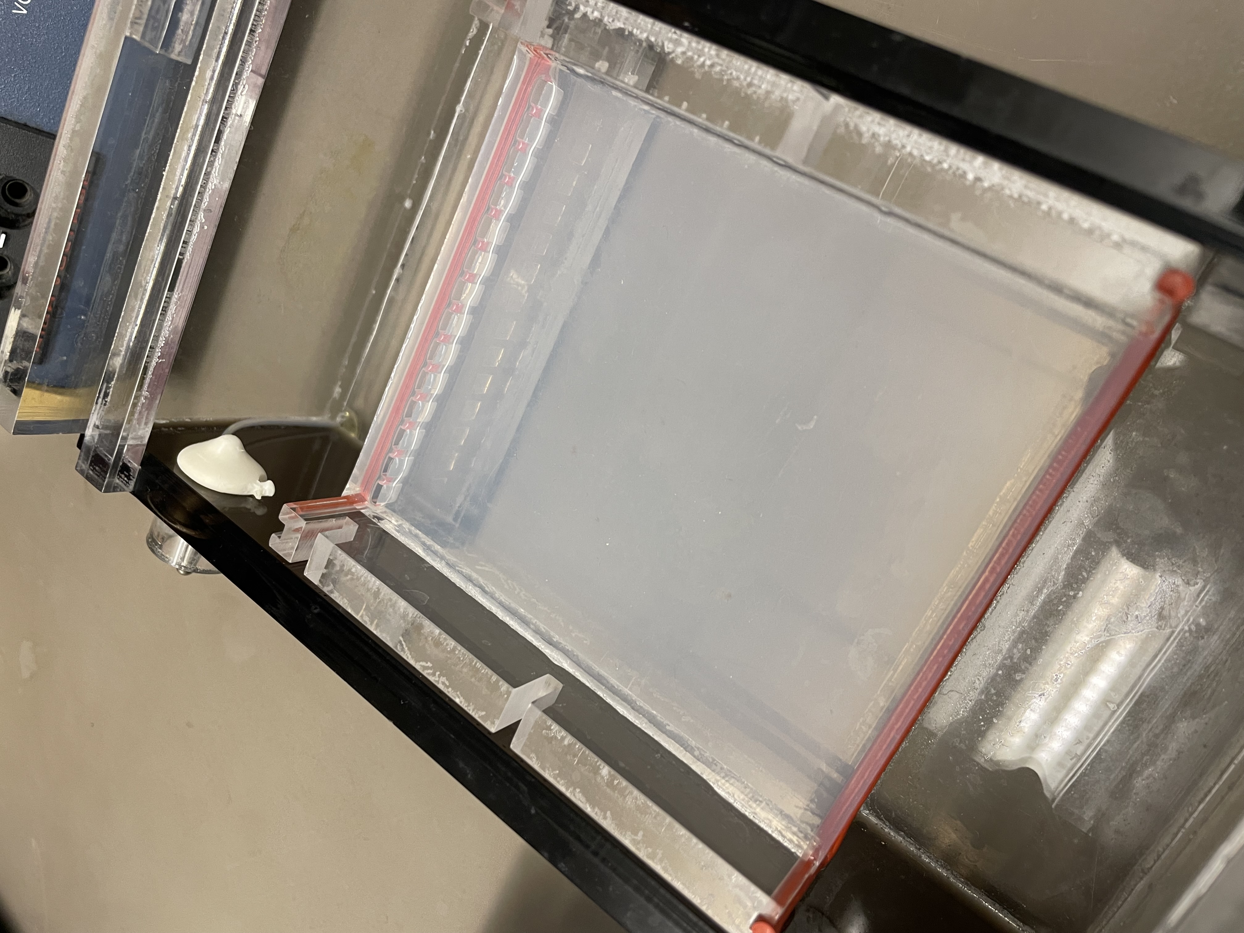 After that, we waited for the agarose solution to cool down for about 20 minutes. We then added 7.5uL of SYBR Safe DNA stain to the solution.