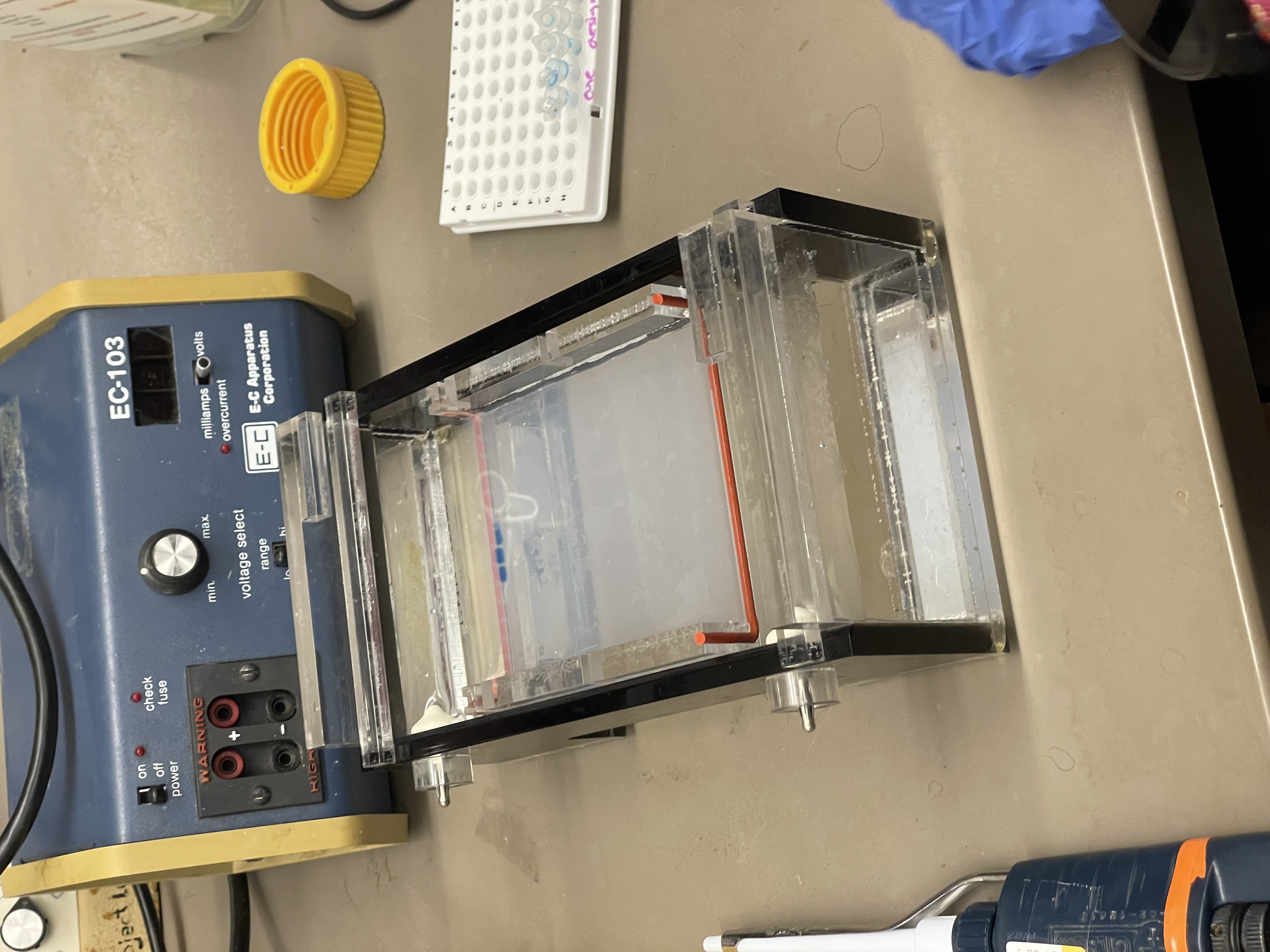 We then connected the gel box to the power supply and ran the gel at 120V for about 30 minutes.