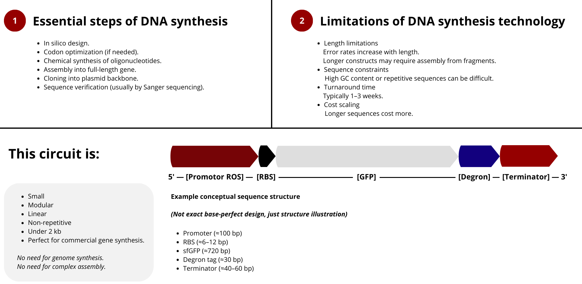 This project constitutes a synthetic biology approach by designing and programming a DNA-based TX–TL circuit that links oxidative stress sensing to a controlled biochemical output to manifest a visible fluorescent signal. The circuit architecture, combined with material constraints imposed by the hydrogel matrix, enables tunable activation, decay, and reversibility of the signal.