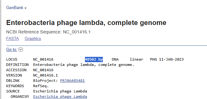 - NCBI. (n.d.). Lambda phage genome, complete sequence. (link)