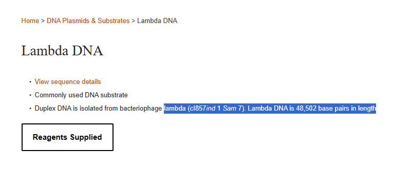 The NEB product specifies Lambda DNA derived from the cI857ind1 Sam7 strain. While this represents a specific laboratory variant, the full genomic backbone corresponds to the canonical 48,502 bp lambda phage genome (NC_001416).